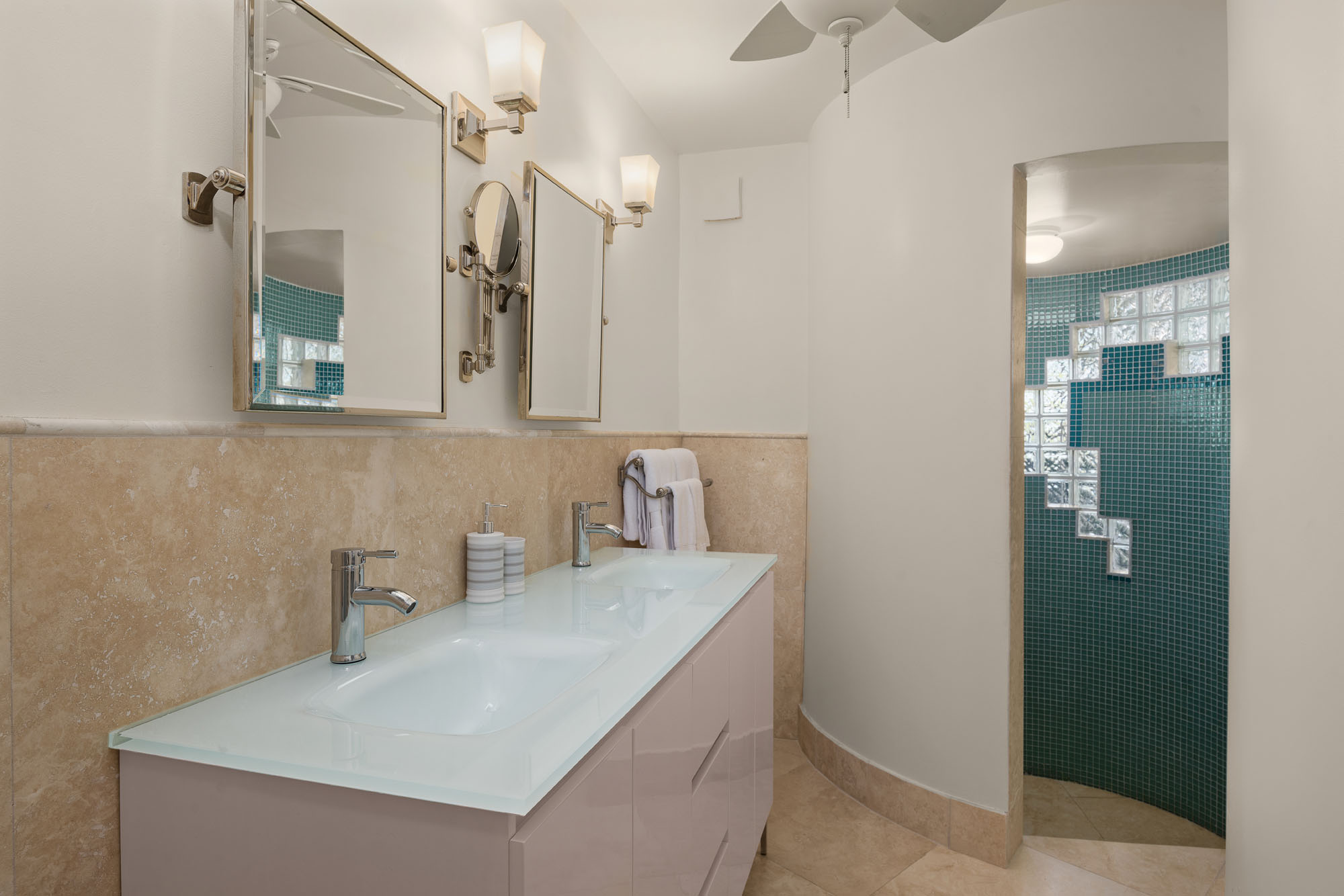 Seashell Room (Master): Upper pool level, king size bed, en-suite bathroom, private outdoor shower in Italian mosaic finish, walk-in wardrobe and TV.