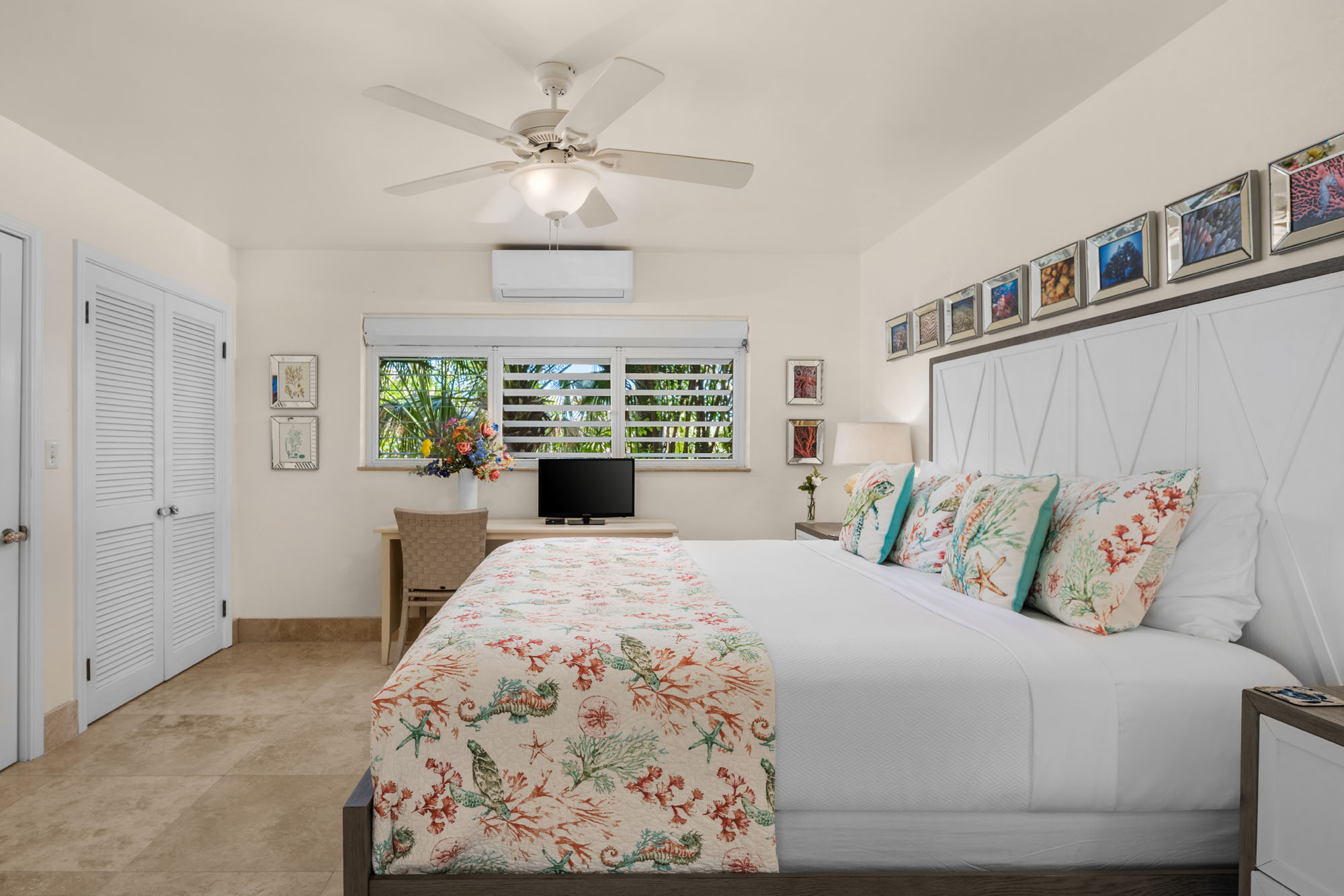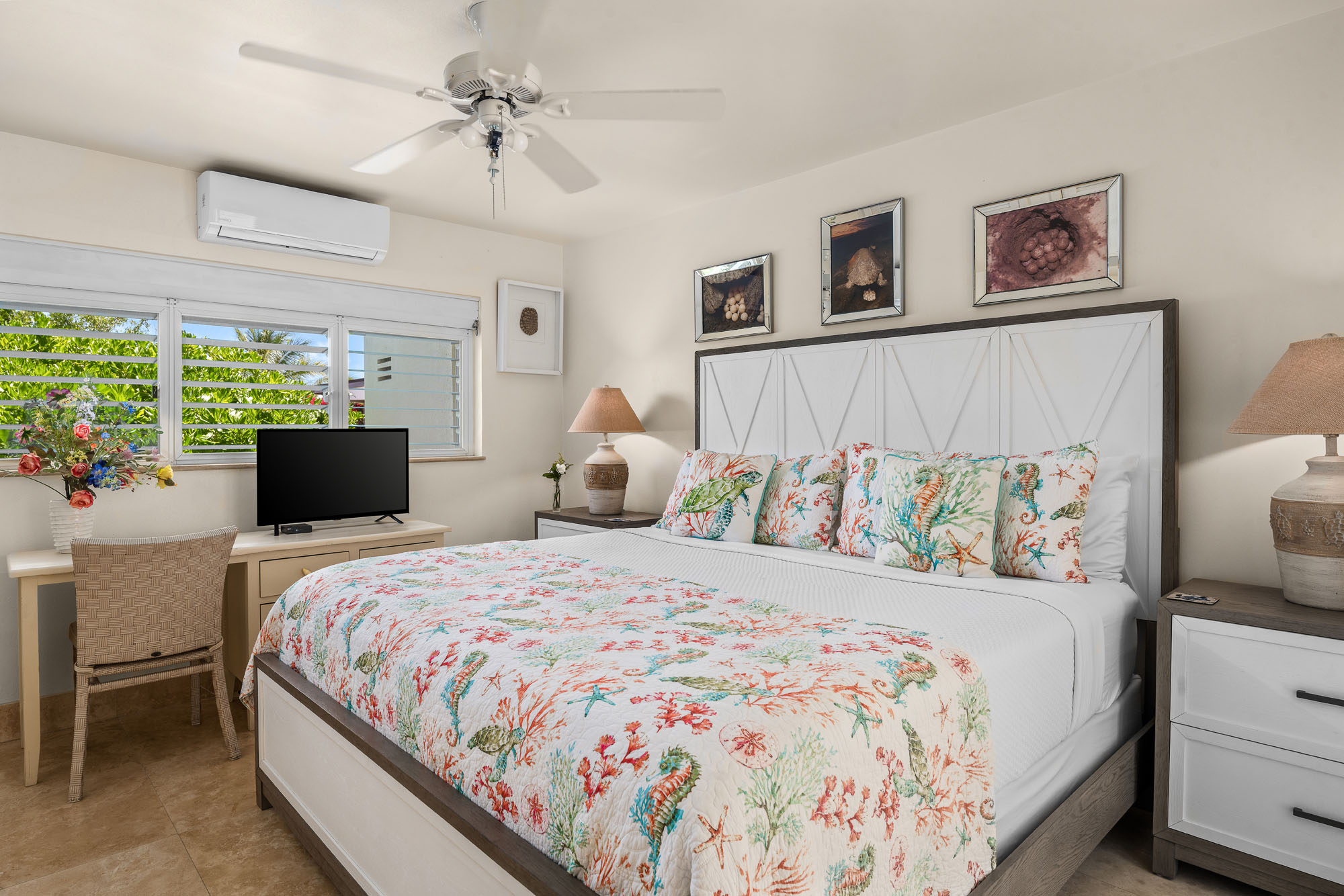 Sea Turtle Room: Beach level, king size bed, private en-suite bathroom with shower and TV.